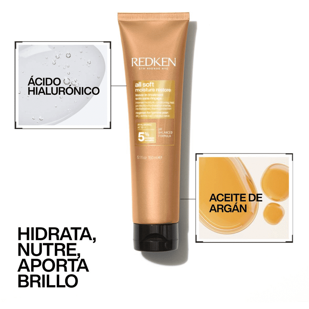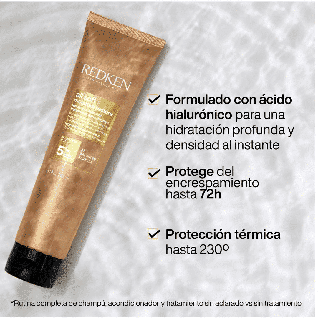 El tratamiento Leave In de Redken All Soft permite desenredar el cabello con completa facilidad sin rotura alguna ni daños. Está enriquecido con ácido hialurónico que mantiene el cabello nutrido hasta 72 horas. Presenta protección frente a herramientas térmicas.