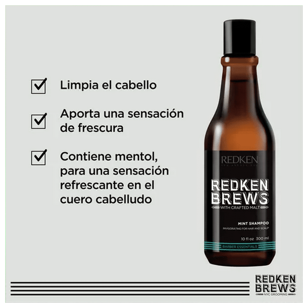 Redken Brews Mint Shampoo está formulado con mentol para la estimulación y calma del cuero cabelludo, proteína para la fuerza y glicerina para la hidratación.