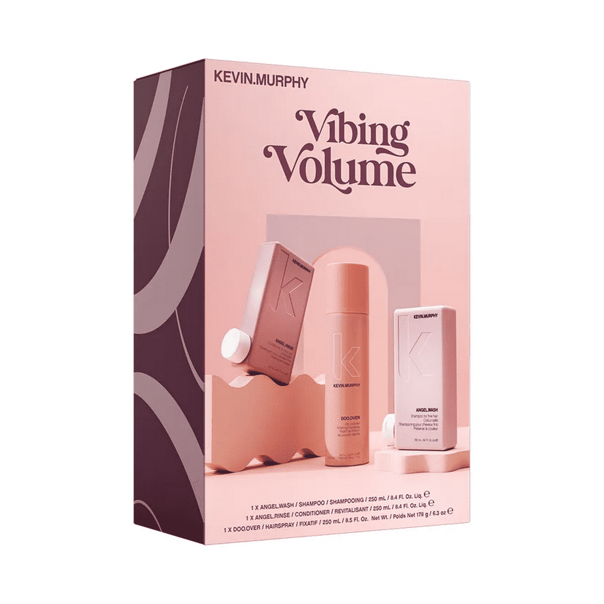 El set Kevin.Murphy Vibing Volume lleva el cabello fino a un nivel completamente nuevo de plenitud y ayuda a crear el peinado de tus sueños. Nutre y aporta al cabello fino y sin vida un volumen lujoso que atrae todas las miradas. El set se compone de champú, acondicionador y laca para el cabello.